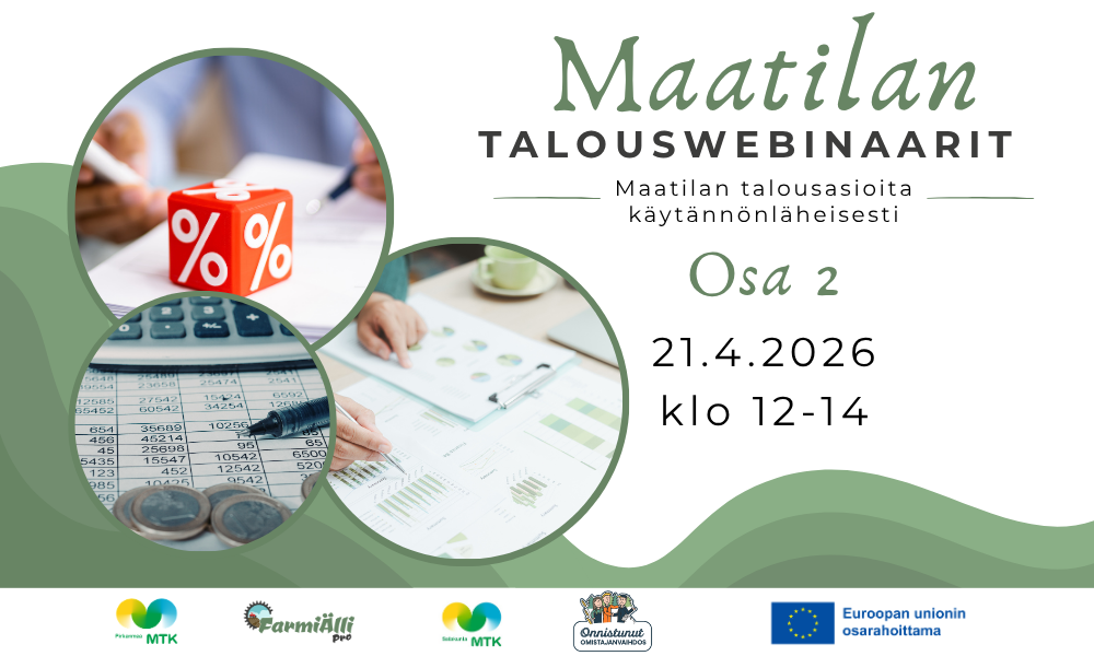 Webinaarissa käsitellään myös maatilan kustannusrakennetta ja avataan kiinteiden sekä muuttuvien kulujen eroja. Lisäksi tarkastellaan kannattavuutta käyttökatteen näkökulmasta ja havainnollistetaan, miten erilaiset muutokset vaikuttavat tilan taloudelliseen tulokseen.
