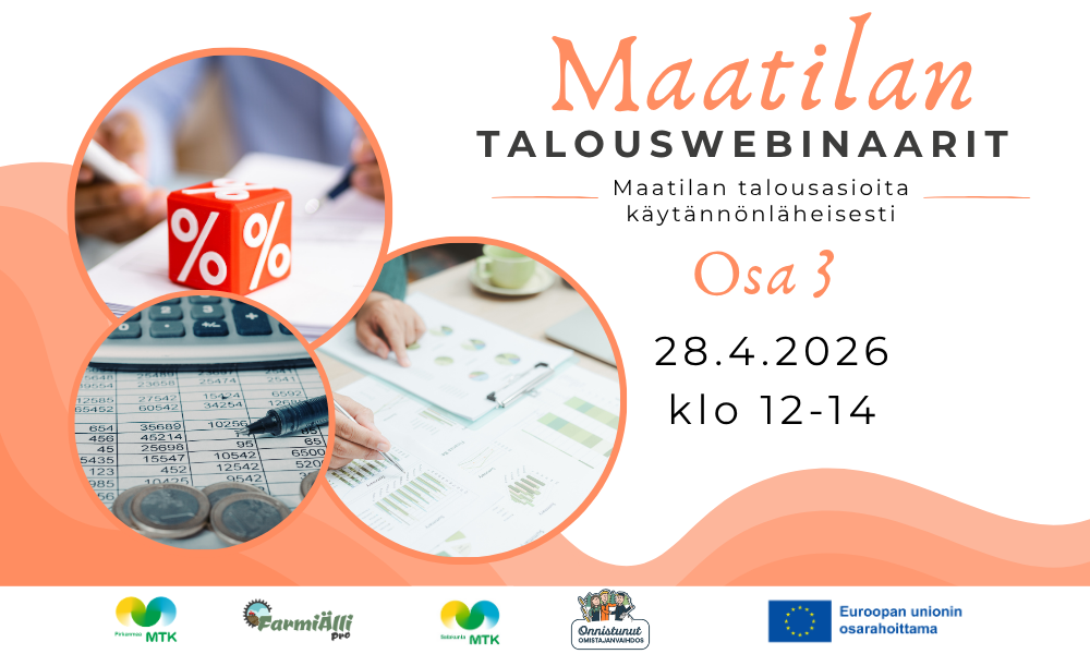 Maatilan talouswebinaarien kolmannessa osassa keskitytään maatilan investointien suunnitteluun, rahoitukseen ja riskien hallintaan. Osallistujat saavat ymmärryksen siitä, miten investoinnit kytkeytyvät tilan liiketoimintasuunnitelmaan ja strategisiin tavoitteisiin sekä millainen rooli niillä on talouden kokonaisuudessa.