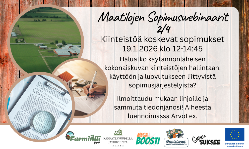 Maatilojen Sopimuswebinaarisarjan toinen osa järjestetään 12.1.2026 klo 12-14:45.