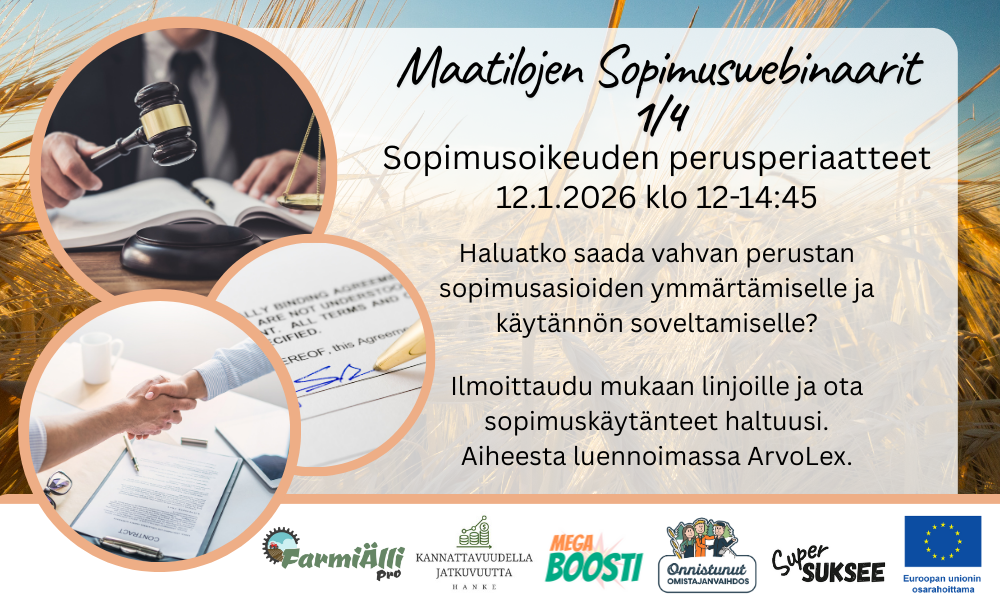 Maatilojen Sopimuswebinaarisarjan ensimmäinen osa järjestetään 12.1.2026 klo 12-14:45.
